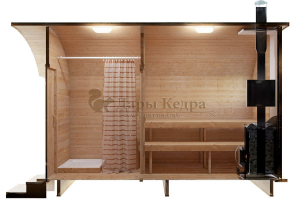 Это более просторная модель за счет увеличенной высоты потолков и ровного пола. В такой модели раздевалка совмещена с моечной. Тут установлен душевой поддон, вешалка, полочка и лавочка из кедра. В парильном отделении по обе стороны расположены двухуровневые открытые полки, печь находится между ними у дальней стены. Время растопки такой бани не превышает 30 минут. По вашему желанию баню-бочку можно укомплектовать козырьком, верандой и печью с внешней загрузкой, благодаря которой весь мусор во время топки остается на улице. Баня-бочка буханка не требует полноценный фундамент, поэтому при необходимости ее можно перенести в другое место.