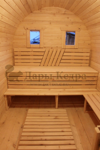 Баня-буханка более просторная за счет увеличенной высоты потолков и ровного пола. На веранде можно оставить вещи или отдохнуть после процедур парения. Лавочки из кедра находятся по всей длине бани-бочки с обеих сторон. Печь расположена в парилке около дальней стены. Время растопки такой бани не превышает 30 минут. В зависимости от выбранного размера баня-бочка буханка с верандой имеет следующую комплектацию: