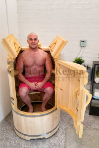 Круглая фитобочка из кедра - это мини парная, которую можно использовать не только в спа-салонах, но и дома. Такая модель наиболее компактна и мобильна. Толщина стенок составляет 40-45 мм, что позволяет увеличить срок службы изделия. Фитобочка оборудована откидными створками, дверцей и отверстием для головы. Верхний скос изделия делает положение головы более комфортным и улучшает обзор. Во время парения человек сидит внутри кедровой бочки, а голова находится снаружи. Благодаря этому исключается возможность перегрева. Подлокотники из кедра, встроенные ручки на створках и двери делают эксплуатацию более удобной.