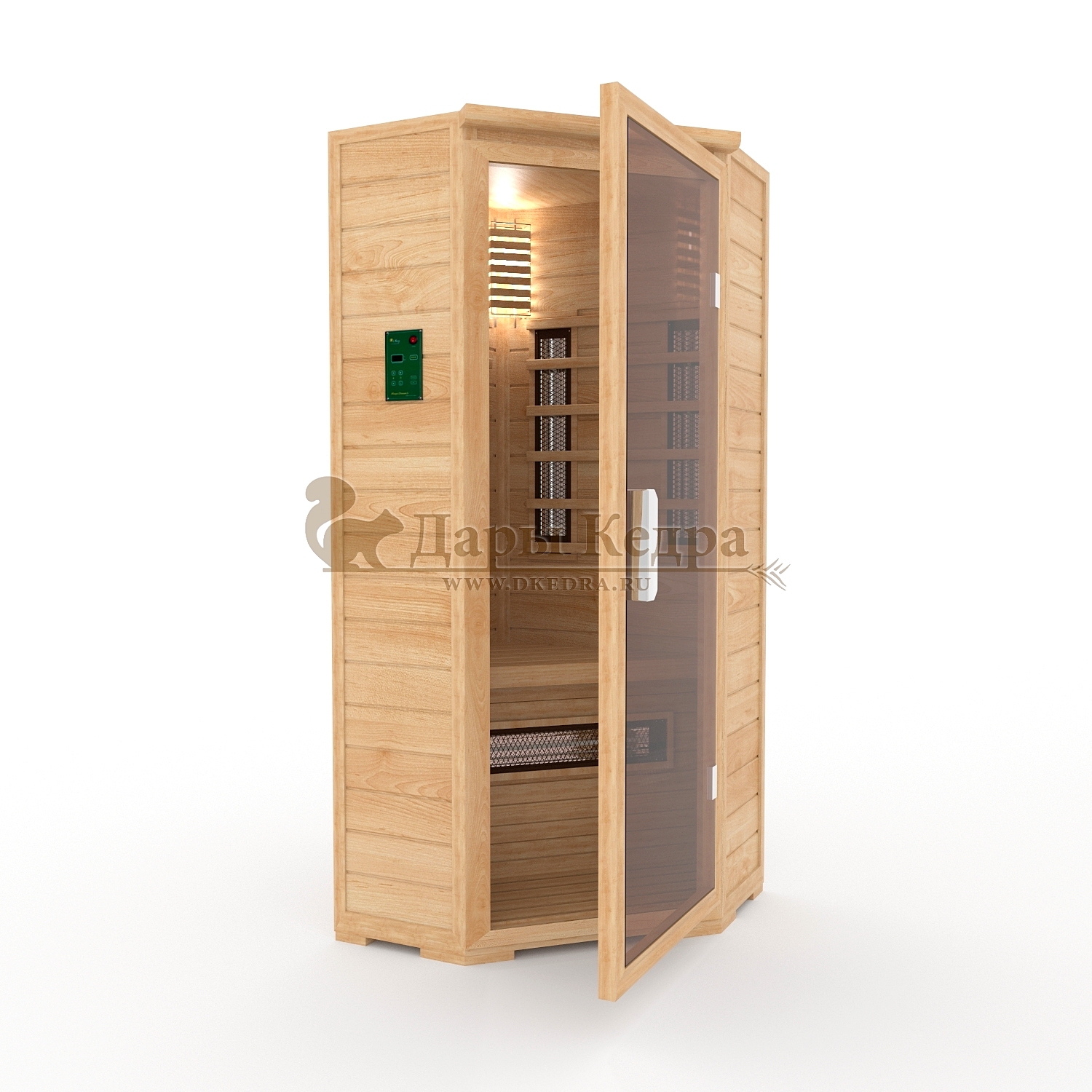 Это специально оборудованная кедровая кабина для прогрева тела человека сухим теплом. Воздух в таких парных не нагревается. Инфракрасные лучи воздействуют на тело, равномерно прогревая мышцы, суставы и органы. Керамические излучатели похожи на лампы, имеют высокую температуру нагрева, поэтому защищены противоожоговыми решетками. Тело человека в таких саунах нагревается интенсивнее. Работает кабина за счет электричества. Установка сауны в угол, позволяет рационально использовать пространство помещения. Подходит как для домашнего использования, так и для коммерции.